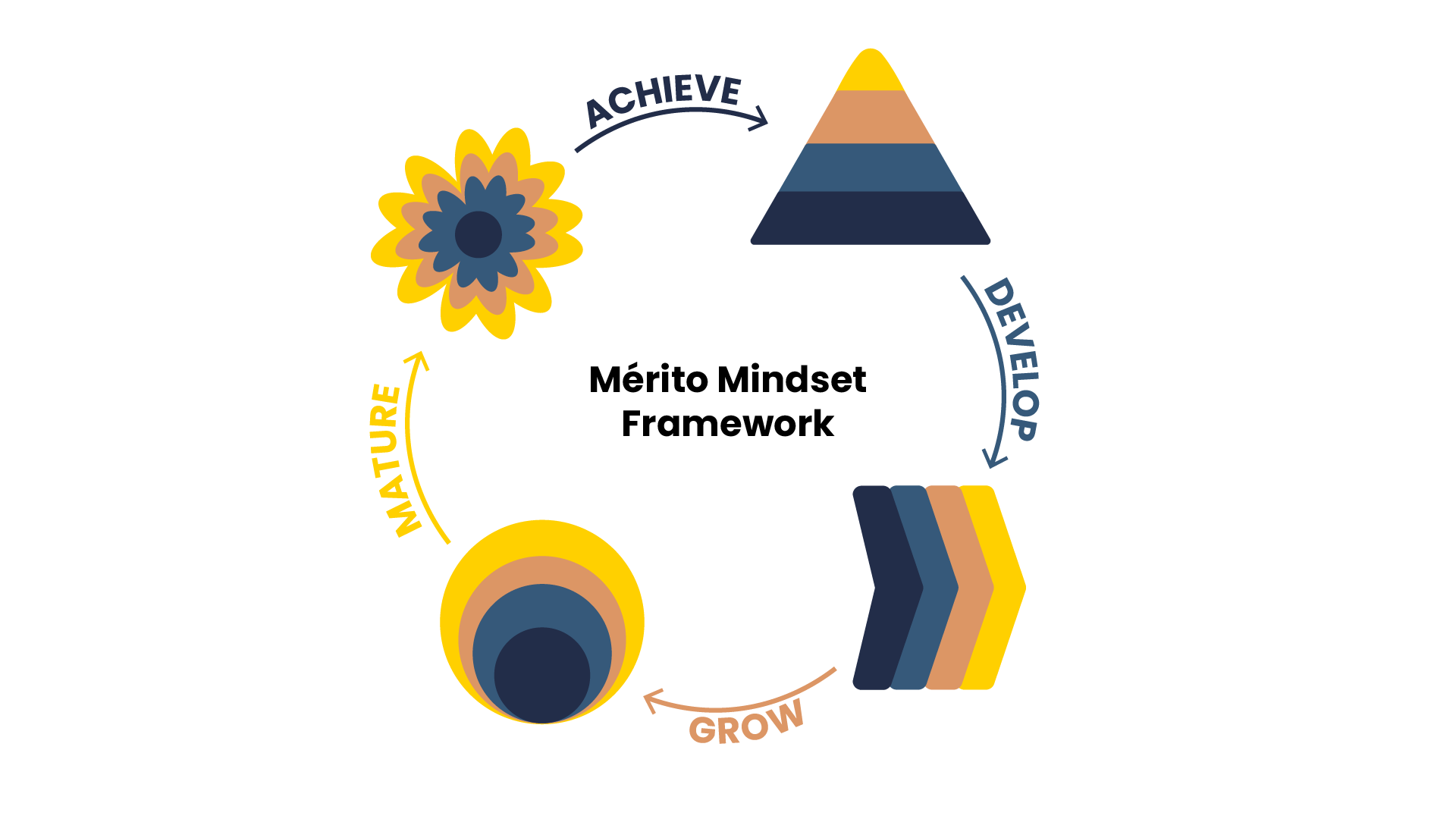 The Mérito Mindset is a new career coaching framework explicitly developed for the professional environment. It is a holistic mindset that connects the dots for professional career growth and success. It focuses on four professional development pillars that merge leadership and human resource concepts and practices. Achieve, Develop, Grow, and Mature.