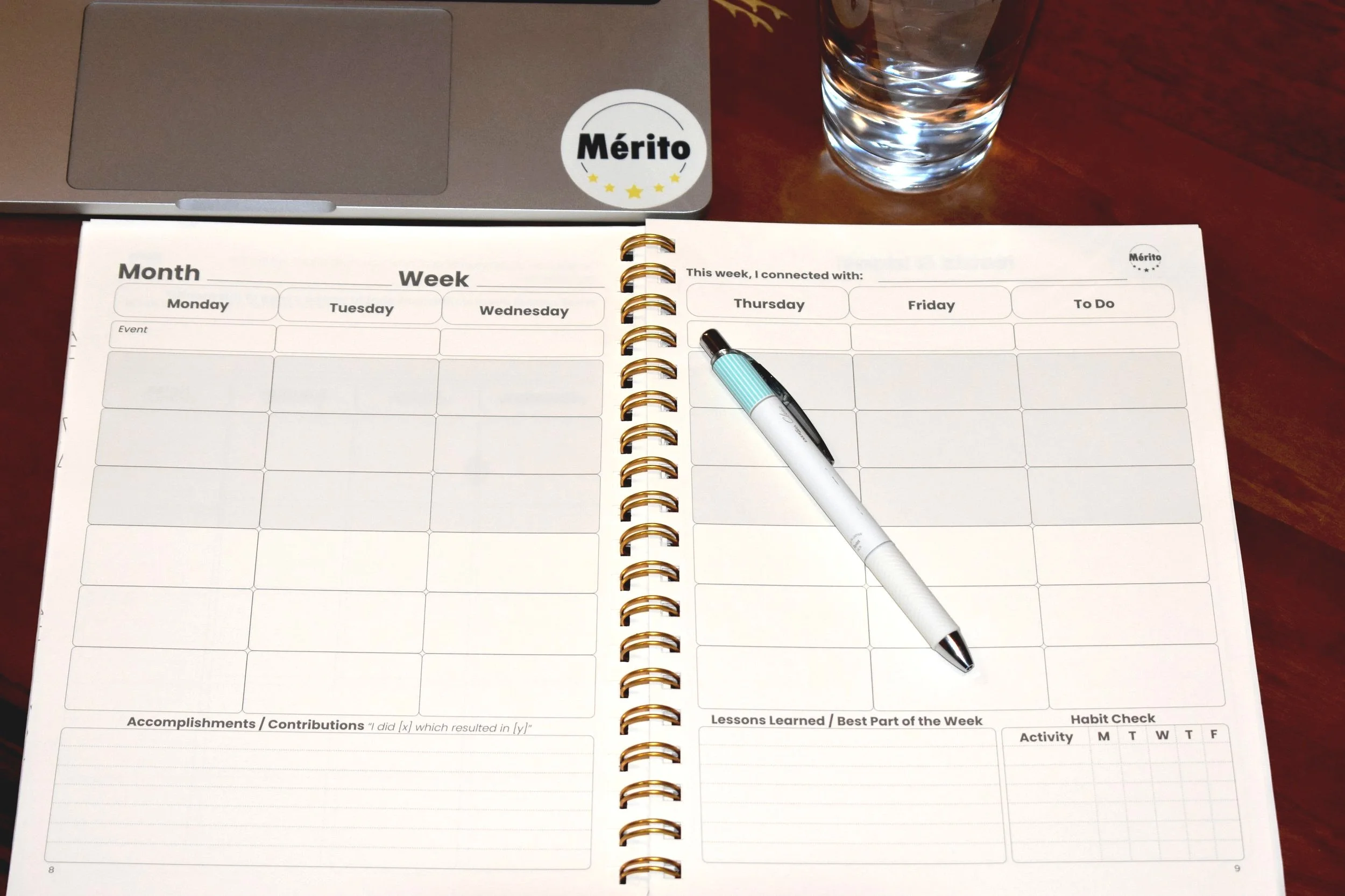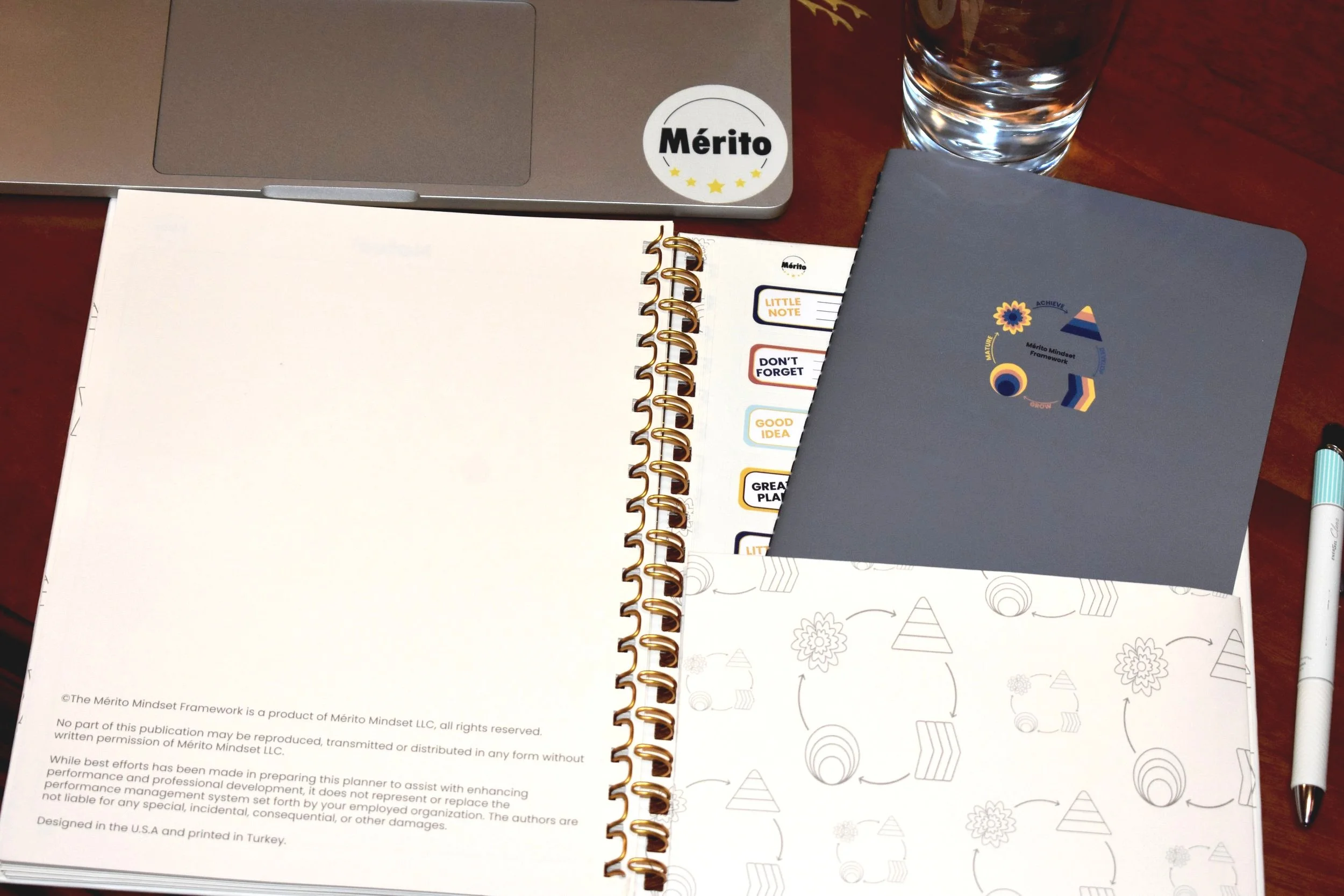 We understand the need for work/life balance, yet staying professionally organized is sometimes an afterthought. Work can be overwhelming, making it challenging to articulate accomplishments, knowledge, skills, and abilities. With a Mérito Mindset Professional Development Journal, you convert an afterthought into a forethought. It is designed and organized to help you plan, execute, and track your performance and development.